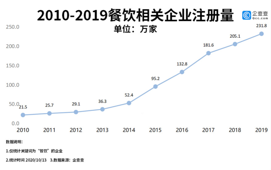 從企業(yè)發(fā)展情況來看,企查查數(shù)據(jù)顯示,過去十年,我國餐飲相關(guān)的企業(yè)注冊量從2014年開始加速增長,2015-2019年一共新注冊了846.4萬家餐飲相關(guān)的企業(yè),2019年的注冊量是231.8萬家,相比十年前——2010年的注冊量(21.5萬家)增長了9.8倍。