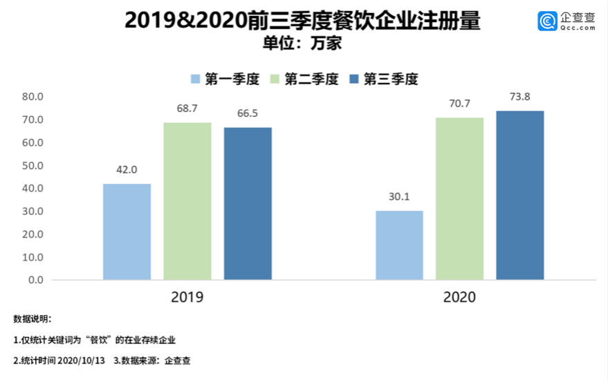 企查查數(shù)據(jù)顯示,今年前三個季度,我國餐飲相關(guān)的企業(yè)共新注冊了174.5萬家,其中第三季度注冊量最多,為73.8萬家,環(huán)比上漲4.4%。